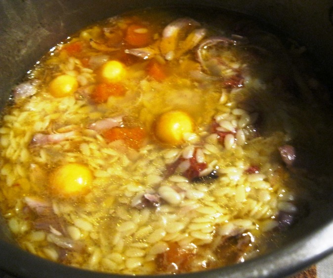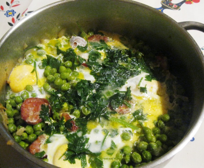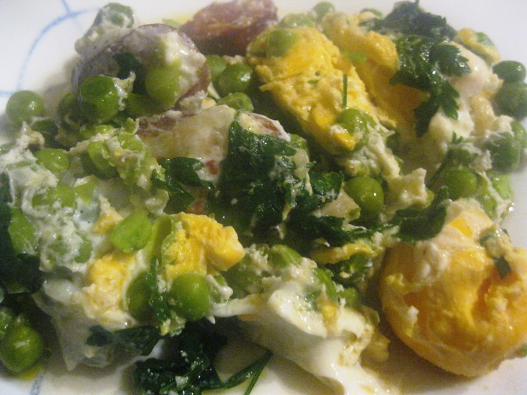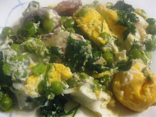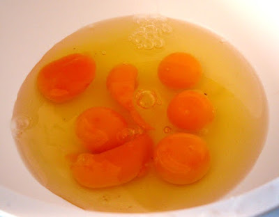 4 - Deitei na frigideira 6 ovos batidos e temperados com sal e pimenta moída e ainda um pezinho de salsa cortado com a tesoura.