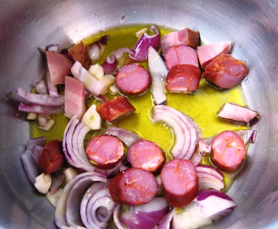 Deixei aquecer e introduzi no tacho meio chouriço (da Beira Baixa) em rodelas e uns cubinhos de bacon.