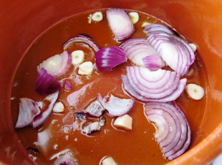 No tacho de barro, coloquei 1 fio de azeite, 2 dentes de alho picados e 1 cebola roxa em meias luas.