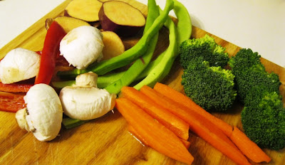 Cortei cenoura, feijão verde e pimento vermelho em tiras.