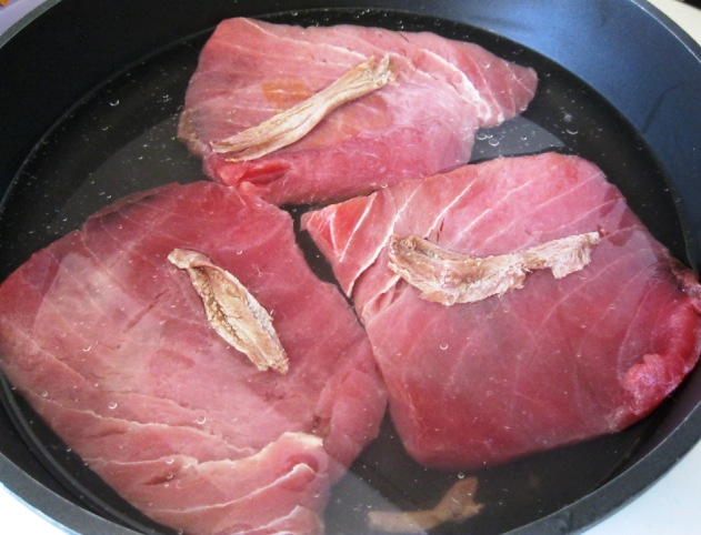 Sobre cada um deles estiquei um filete de anchova, reguei com 2 colheres de sopa de vinagre de vinho branco e cobri com água fria.