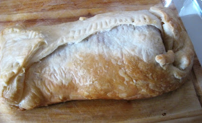 Fechei a placa de massa em volta do lombinho e farinheira, acertando as extremidades com uma faca e...