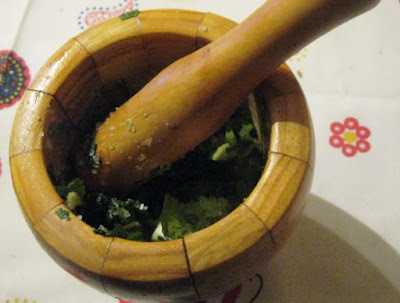 Cortei 3 dentes de alho (grandóes) e um molho de coentros para dentro de um almofariz.