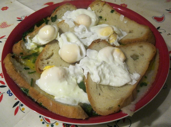 Depois escalfei 6 ovos, em água ligeiramente acidulada com vinagre.